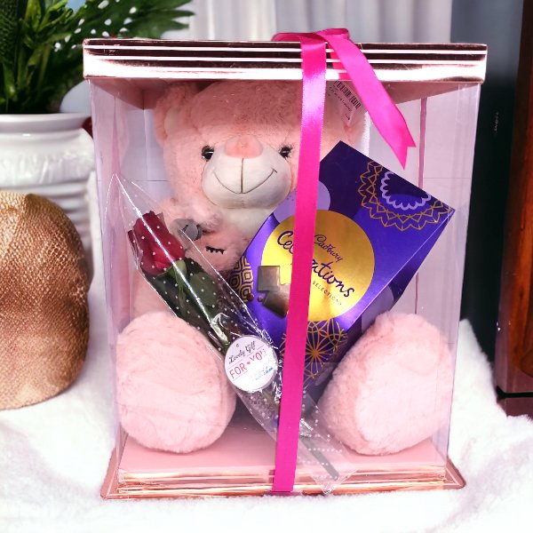 Imagine the joy when your beloved receives a cuddly teddy bear, a single red rose, and a Cadbury Celebration Hamper—all for under Rs.1500. Order now from FTN to bring smiles to your special moments in the heart of Kathmandu.