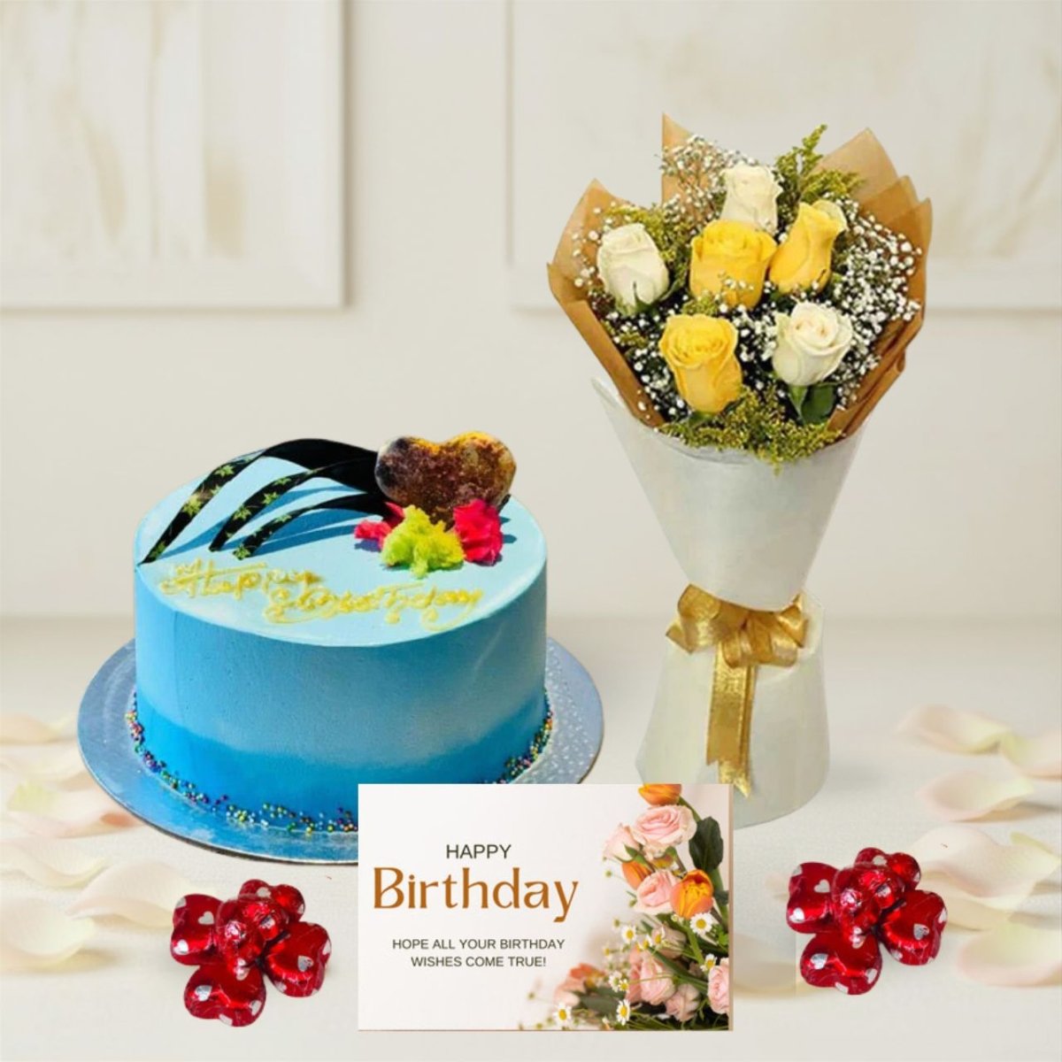 Celebrate special moments with our Luxury Blueberry Cake and Rose Bouquet Gift Set featuring Delicious Blueberry Delight Cake from Hotel Himalaya, a white and yellow mixed rose bouquet, gourmet chocolates, and a Happy Birthday card with same day delivery inside Kathmandu Valley.