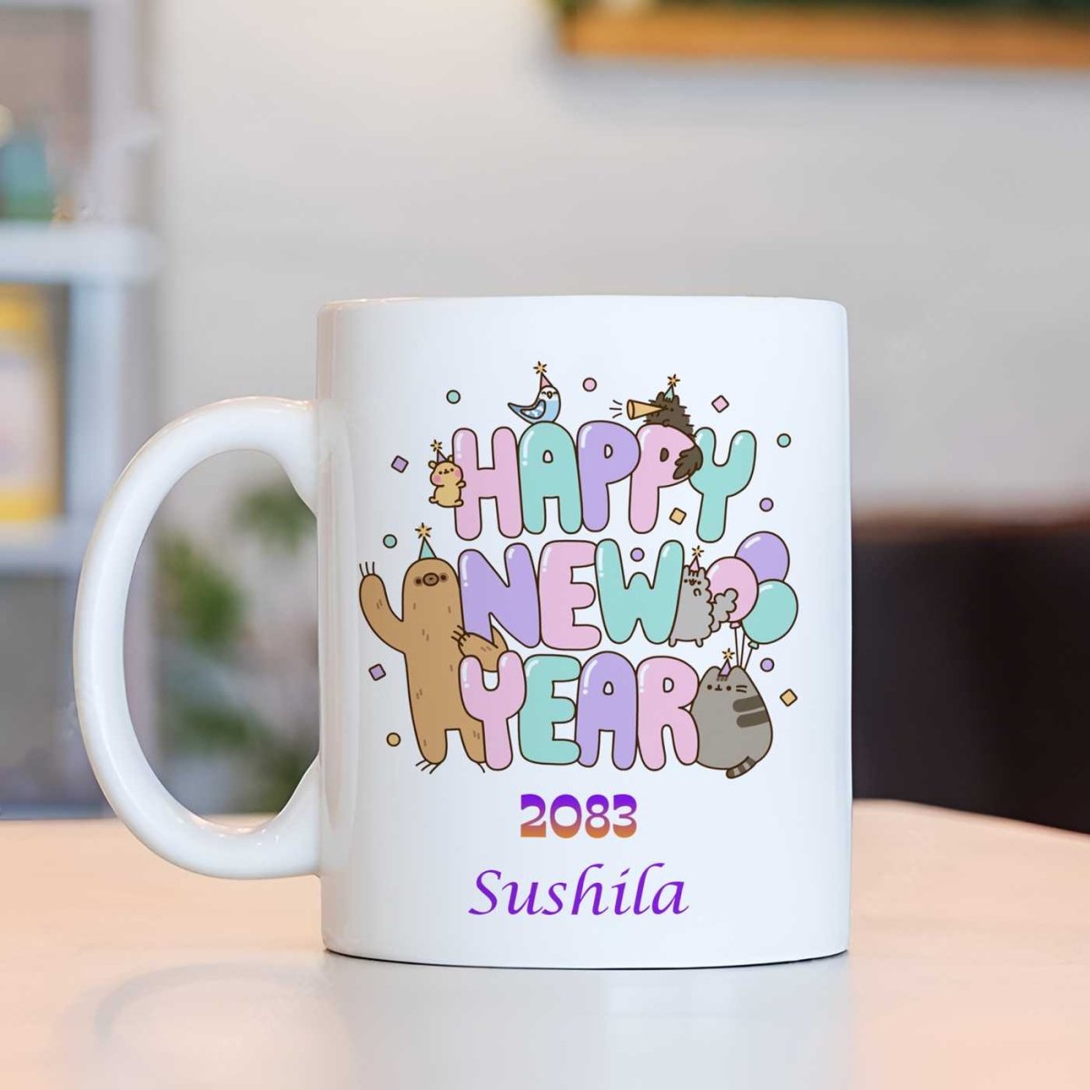 Celebrate the New Year 2083 in style with this adorable personalized name mug. Featuring a cute design, it's the perfect gift for loved ones or a treat for yourself. Customize with any name to make it uniquely special. Ideal for coffee, tea, or hot beverages.