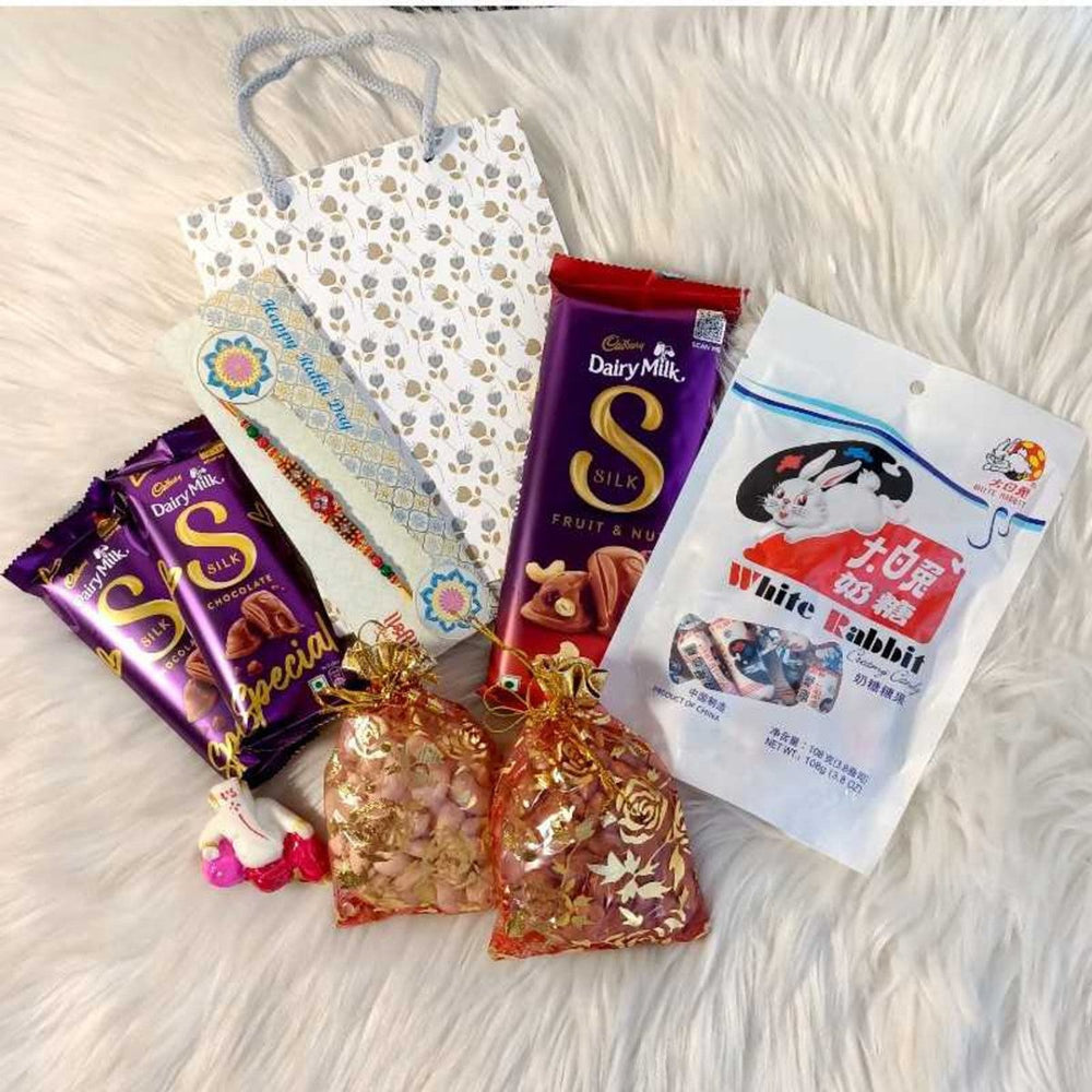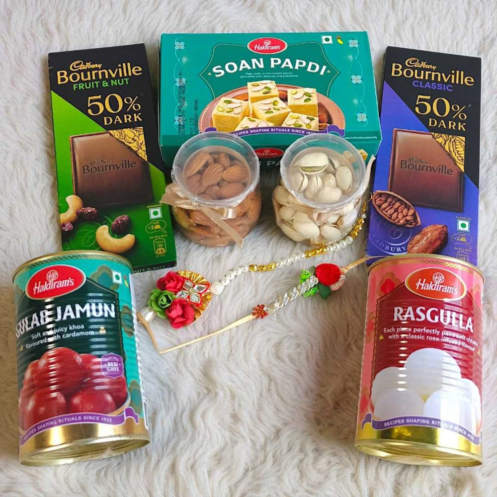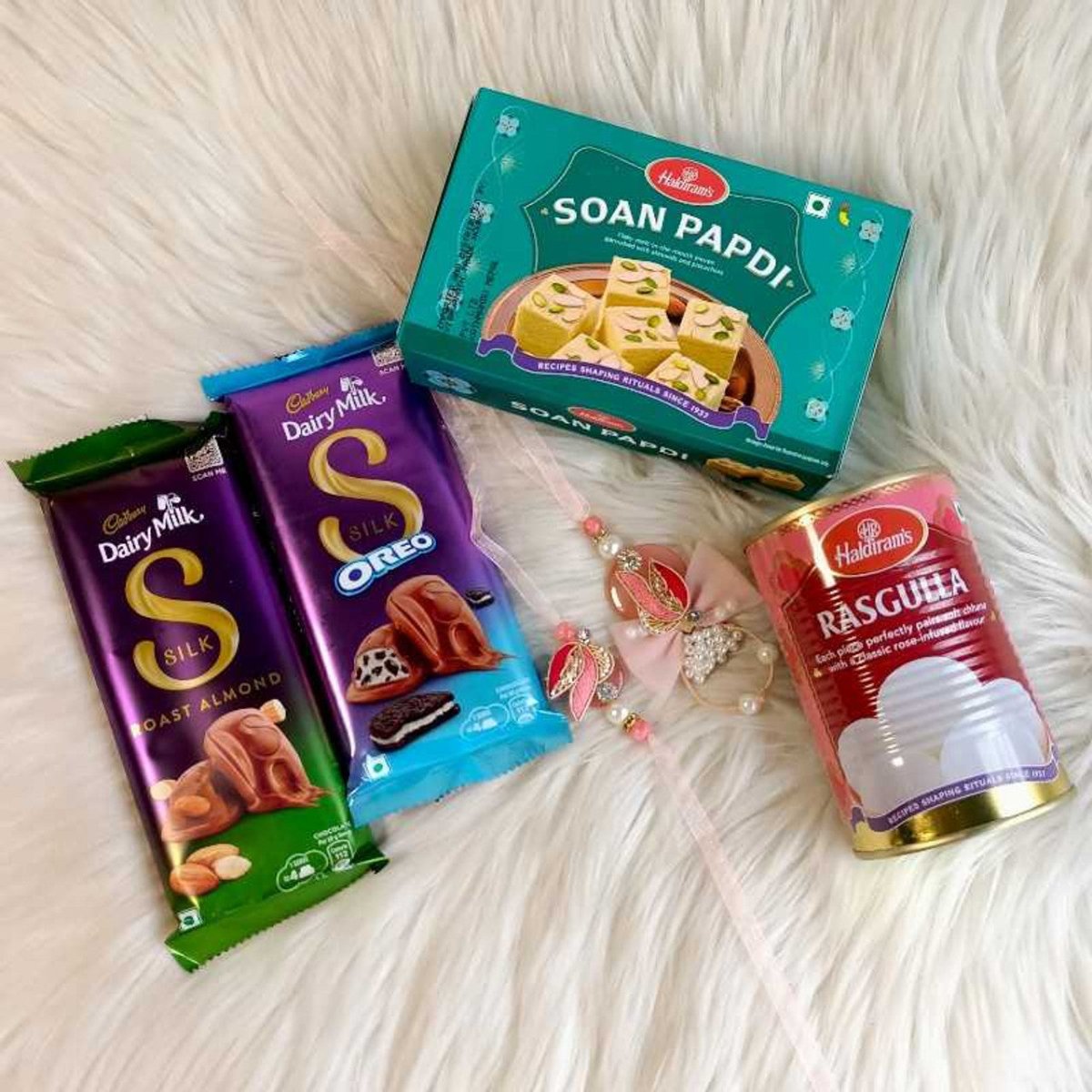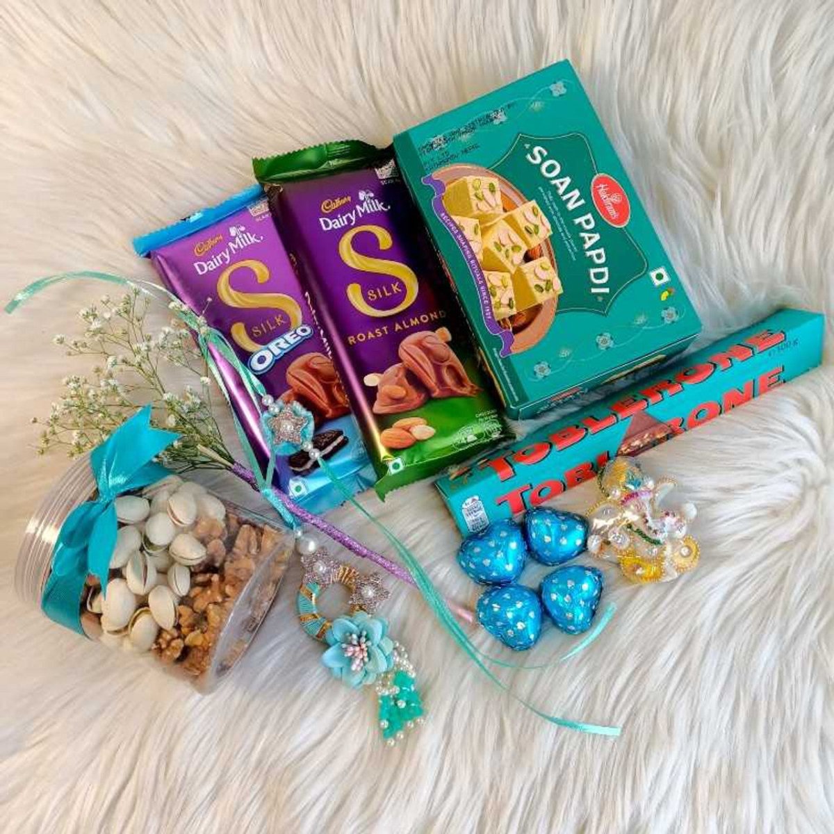For an extra touch of luxury, elevate the celebration with our "Cadbury Silk Chocolates with Kangan Gift Set." This sophisticated pairing merges the richness of Cadbury Silk chocolates with the elegance of a kangan, creating a truly special gift.