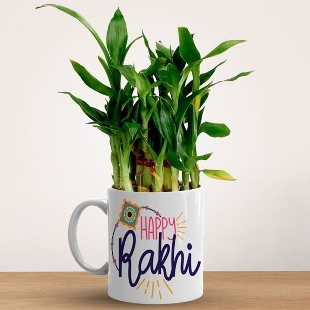 Green Greetings: Plant in Mug with Chocolate and Rakhi Gift