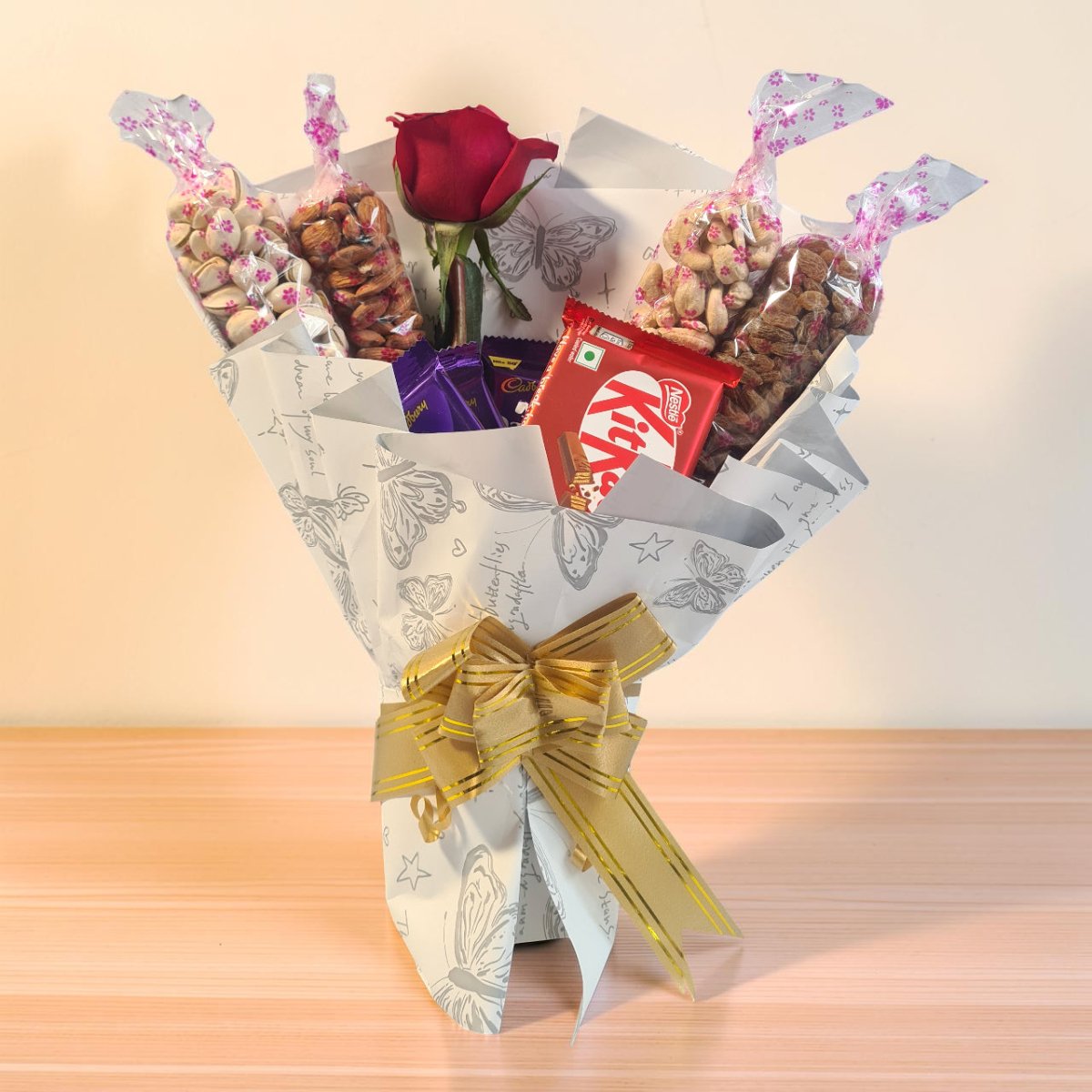 Luxury Nutty Chocolate Rose Bouquet is a beautifully wrapped bouquet featuring premium dry nuts, Cadbury Dairy Milk, KitKat chocolates, and a single red rose. Thoughtfully designed with a perfect mix of health, sweetness, and elegance, it’s ideal for special gifting with delivery all over Nepal.